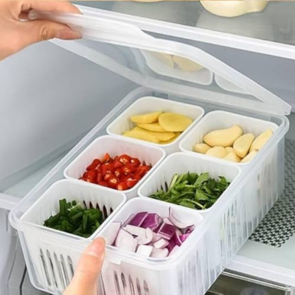 Introducing the Fridge Storage Containers, a comprehensive solution to all your storage needs. These refrigerator organizer boxes are designed to help you keep your fridge neat, tidy, and well-organized. The fridge storage boxes not only offer a convenient way to store your groceries but also add a touch of sophistication to your kitchen. The Fridge Storage Containers Set includes a variety of sizes, making it ideal for storing various types of food items. From masala box for kitchen to vegetable storage box for fridge, each container is designed to meet your specific needs. The plastic boxes for storage are made of high-quality, durable material that ensures longevity. The drain compartment keeps the flavor, the drain compartment in the box can drain water quickly and prolong the preservation time. There areĀ 6 inner boxes of the same size, which are very suitable for keeping your favorite foods fresh and safe. They can be placed in the refrigerator to save space and avoid cross infection. One of the unique features of these refrigerator boxes for storage is their airtight seal. This feature keeps your food fresh for longer periods, making them perfect for storing perishable items like vegetables and fruits. The fridge organiser storage boxes are also perfectly stackable, making them an ideal space-saving solution. In addition to being a practical storage solution, the Fridge Storage Containers are also a stylish addition to your kitchen accessories items. With their sleek design and transparent body, these fridge accessories items let you see what’s inside without having to open each one.